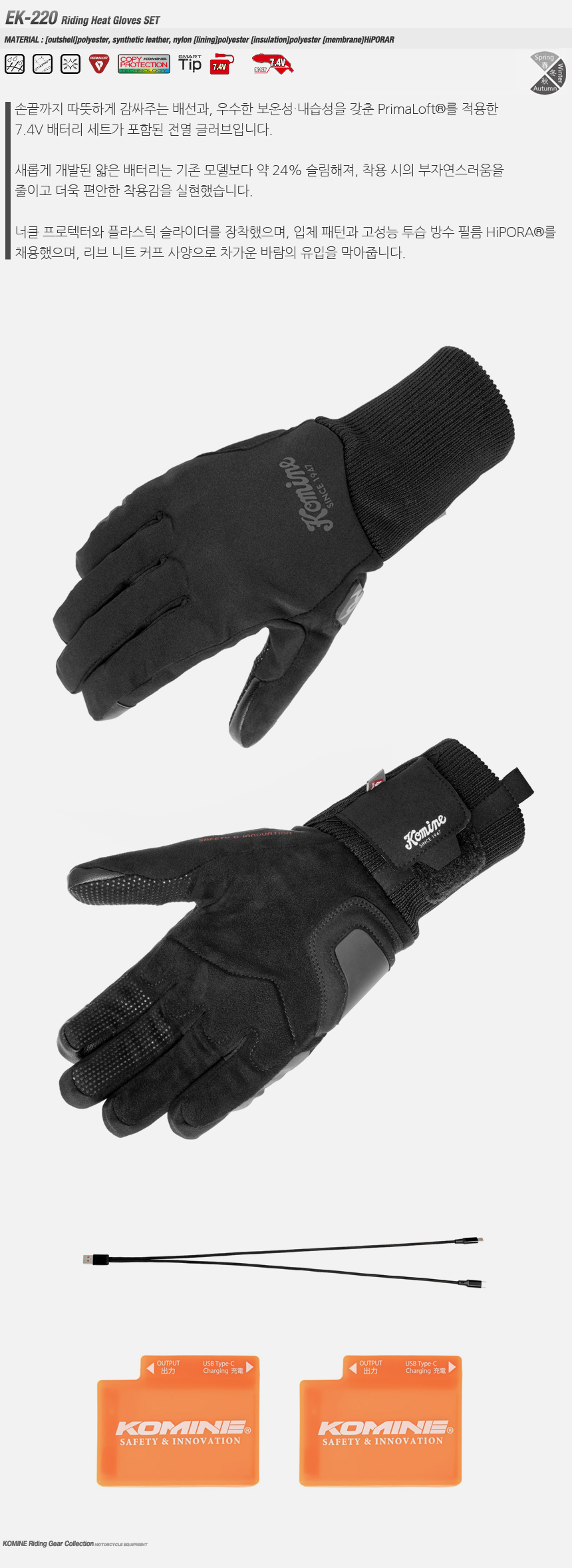 손끝까지 따뜻하게 감싸주는 배선과, 우수한 보온성·내습성을 갖춘 PrimaLoft®를 적용한 7.4V 배터리 세트가 포함된 전열 글러브입니다.