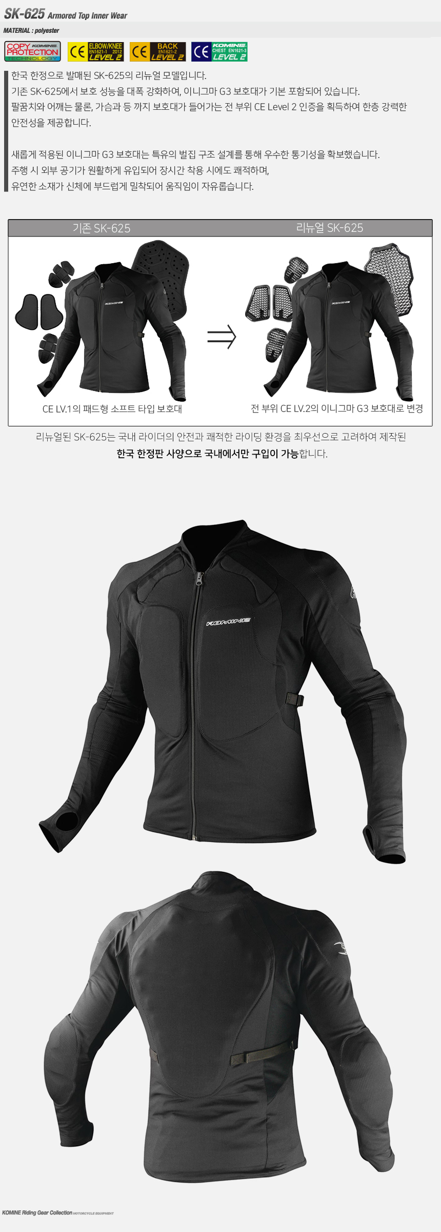한국 한정으로 발매된 SK-625의 리뉴얼 모델입니다. 기존 SK-625에서 보호 성능을 대폭 강화하여, 이니그마 G3 보호대가 기본 포함되어 있습니다. 팔꿈치와 어깨는 물론, 가슴과 등 까지 보호대가 들어가는 전 부위 CE Level 2 인증을 획득하여 한층 강력한 안전성을 제공합니다. 새롭게 적용된 이니그마 G3 보호대는 특유의 벌집 구조 설계를 통해 우수한 통기성을 확보했습니다. 주행 시 외부 공기가 원활하게 유입되어 장시간 착용 시에도 쾌적하며, 유연한 소재가 신체에 부드럽게 밀착되어 움직임이 자유롭습니다.