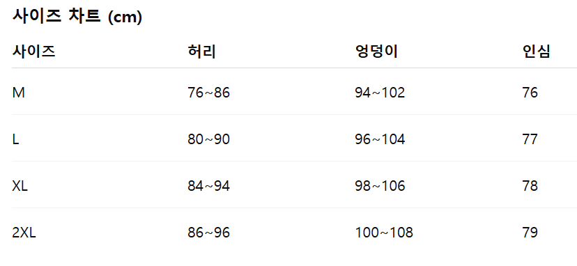 ※ 허리 및 엉덩이 치수는 제품 실측이 아닌, 자체 기준에 따른 데이터입니다.