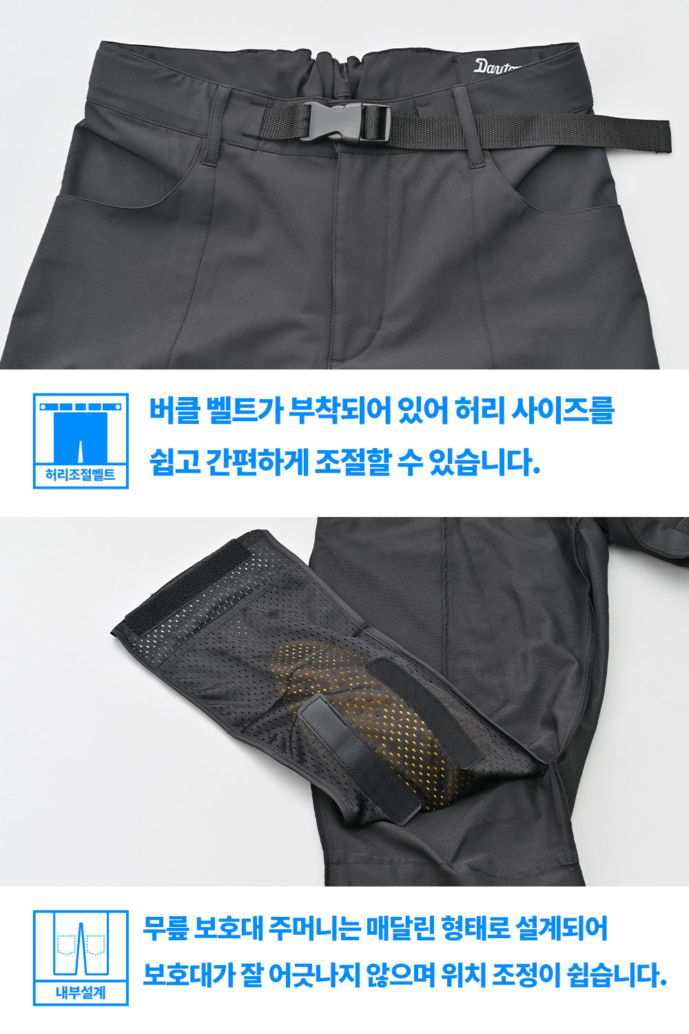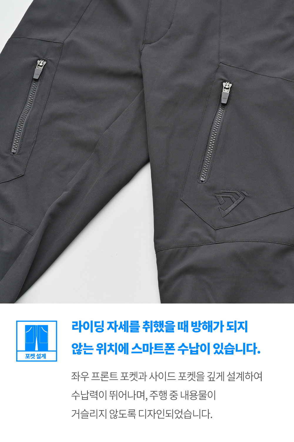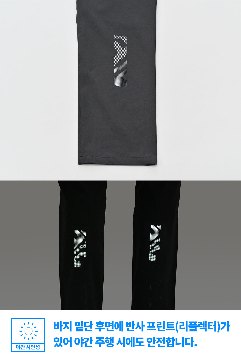 또한, 바지 밑단 후면의 반사 프린트(리플렉터)가 시인성을 확보하여 야간 주행 시에도 안전합니다.